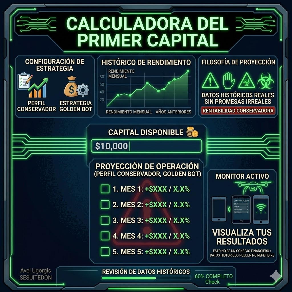 Introduce tu capital disponible y la calculadora proyecta el crecimiento mes a mes con el Golden Bot en perfil conservador. Con datos históricos reales.