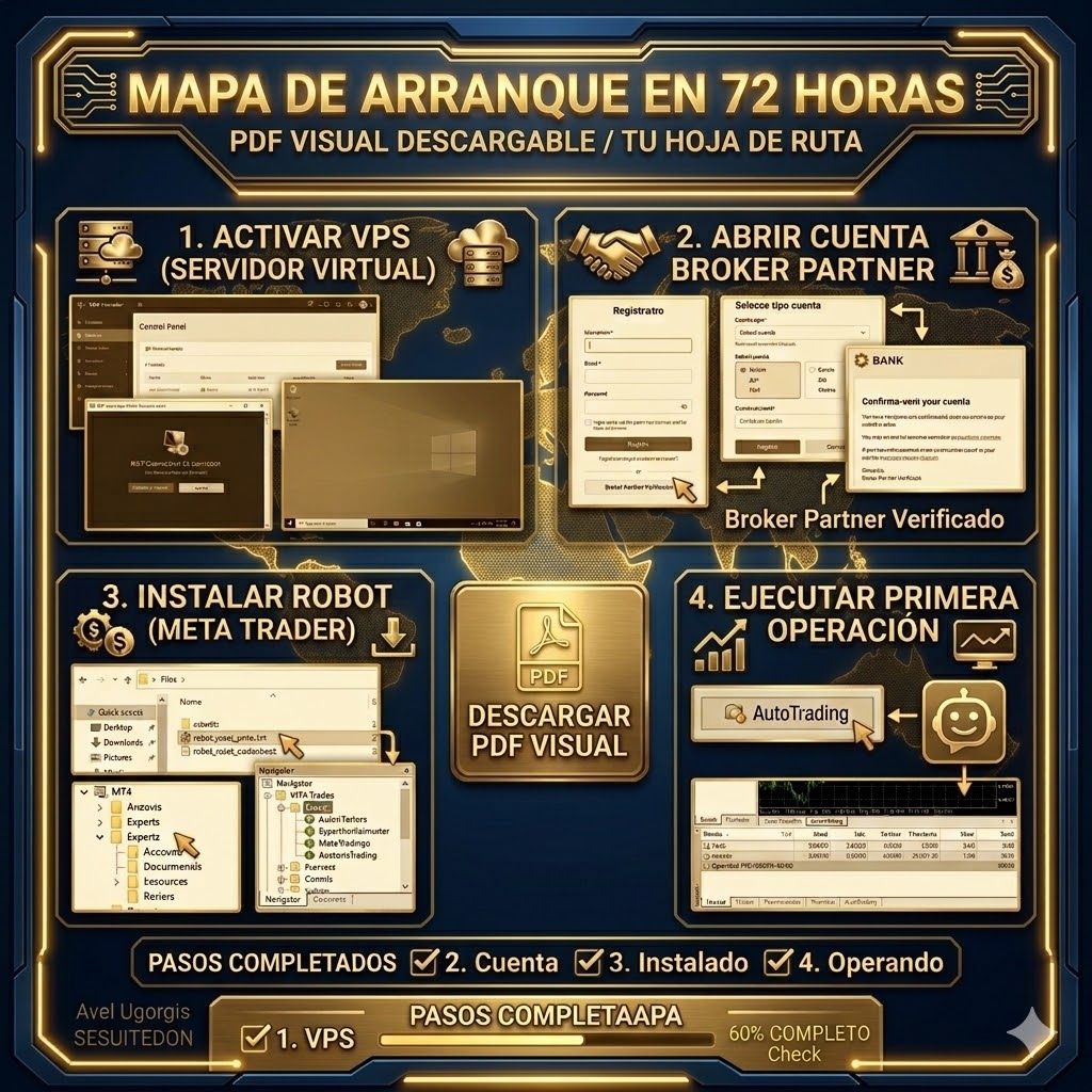 PDF visual con los 4 pasos exactos para ir de cero a robot operando en cuenta real. Con capturas reales de cada paso.